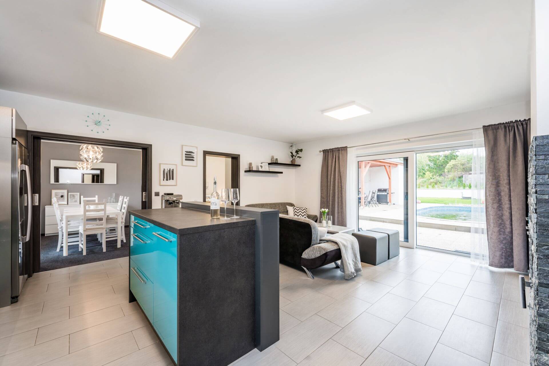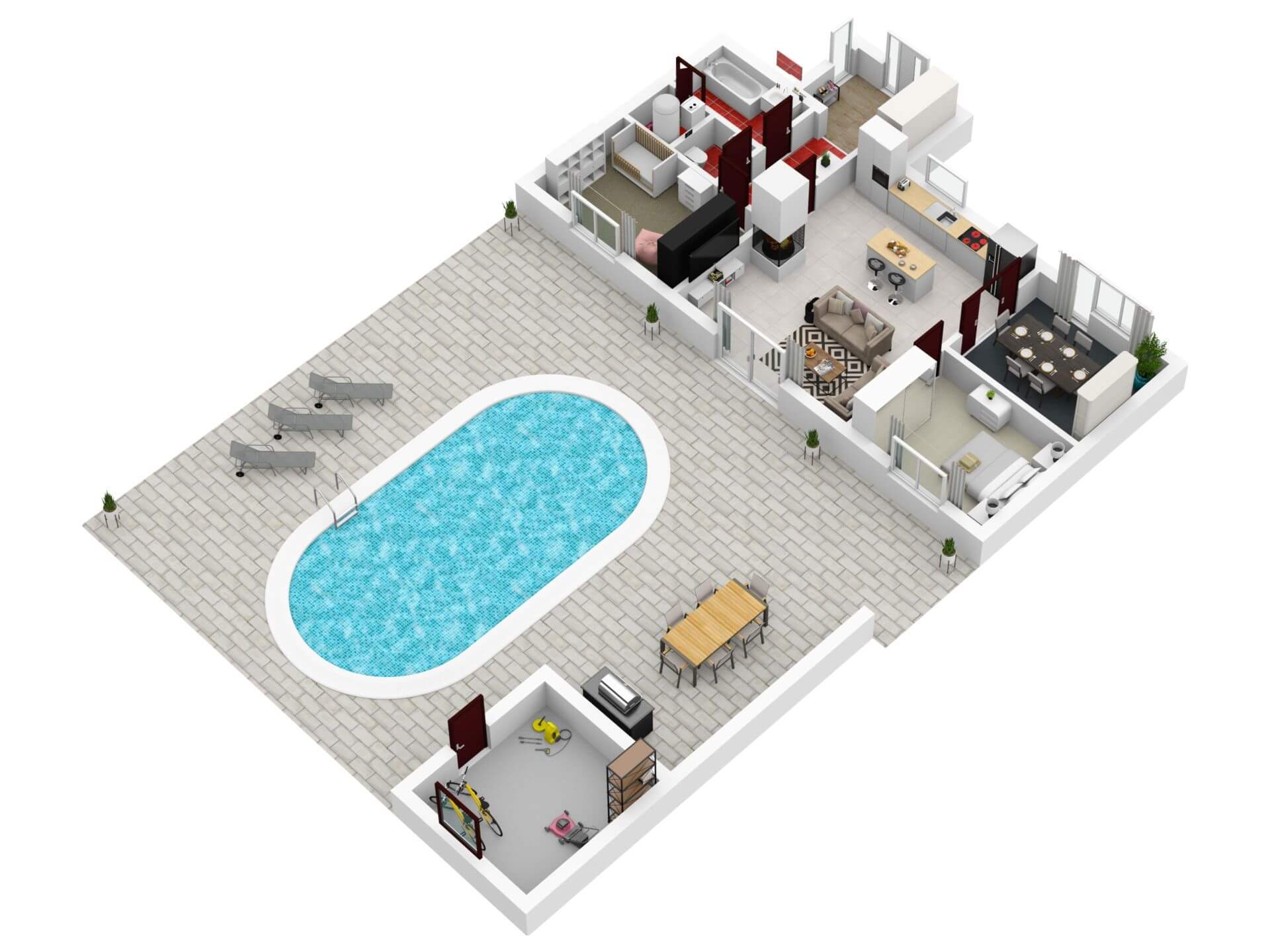 Čas strávený na zahradě vám jistě zpříjemní bazén s prostornou terasou a přilehlou pergolou. Zahradní domek (11m2) zajistí dostatek úložného prostoru na zahradní techniku, jízdních kol či jiného příslušenství.
